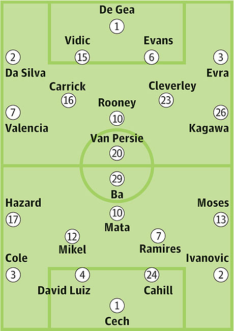 Subs from Lindegaard, Johnstone, Buttner, Welbeck, Powell, Giggs, Anderson, Young, Smalling, Ferdinand, Hernández
